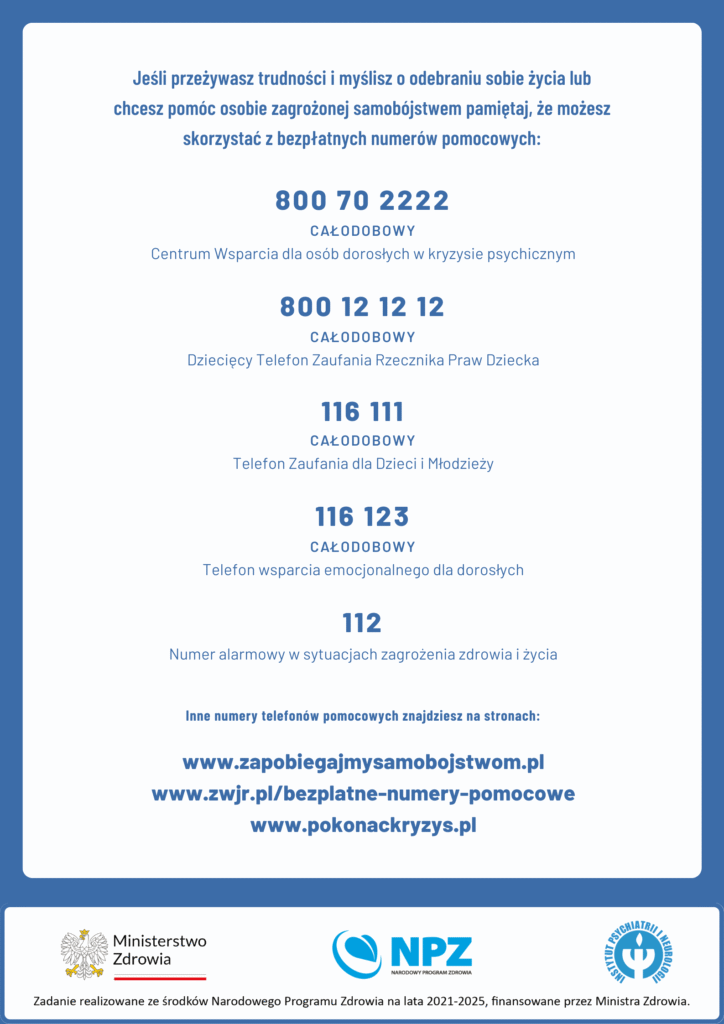 Przy tej okazji pragniemy przypomnieć o dostępnych formach pomocy psychologicznej. Poniżej zamieszczamy informacje o telefonach zaufania oraz infoliniach wsparcia dla dzieci, młodzieży i dorosłych: