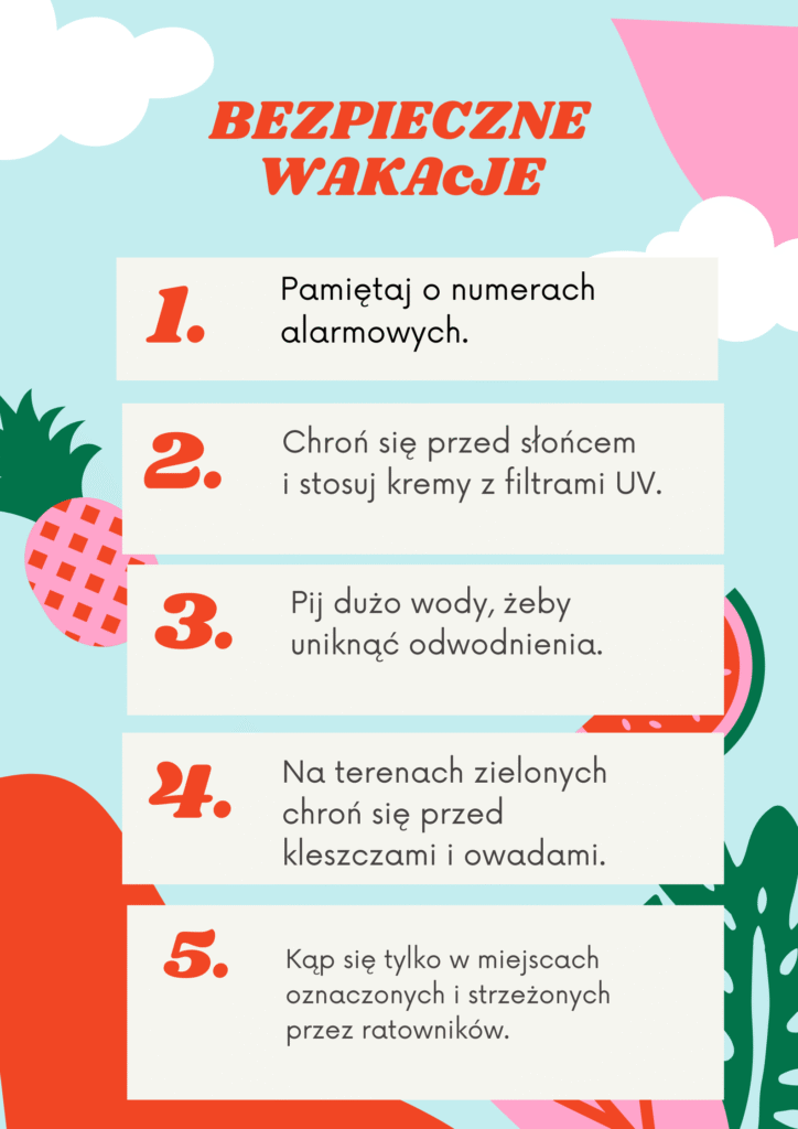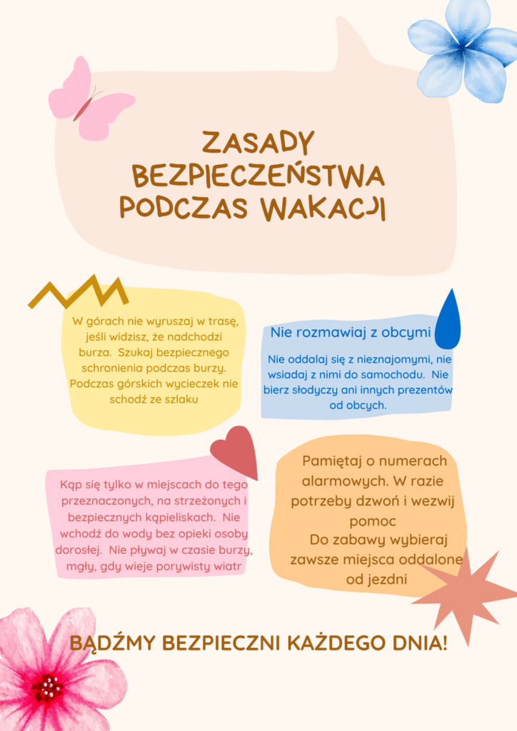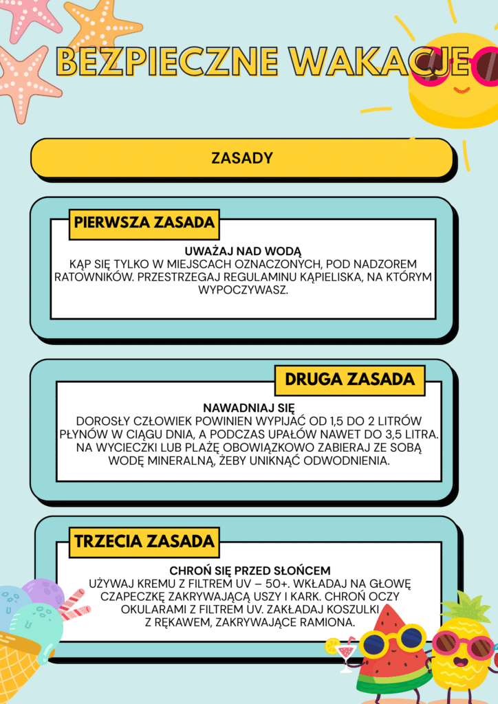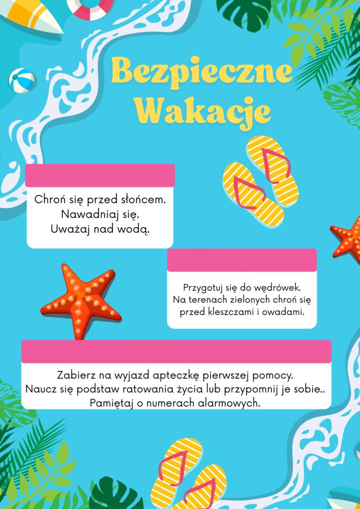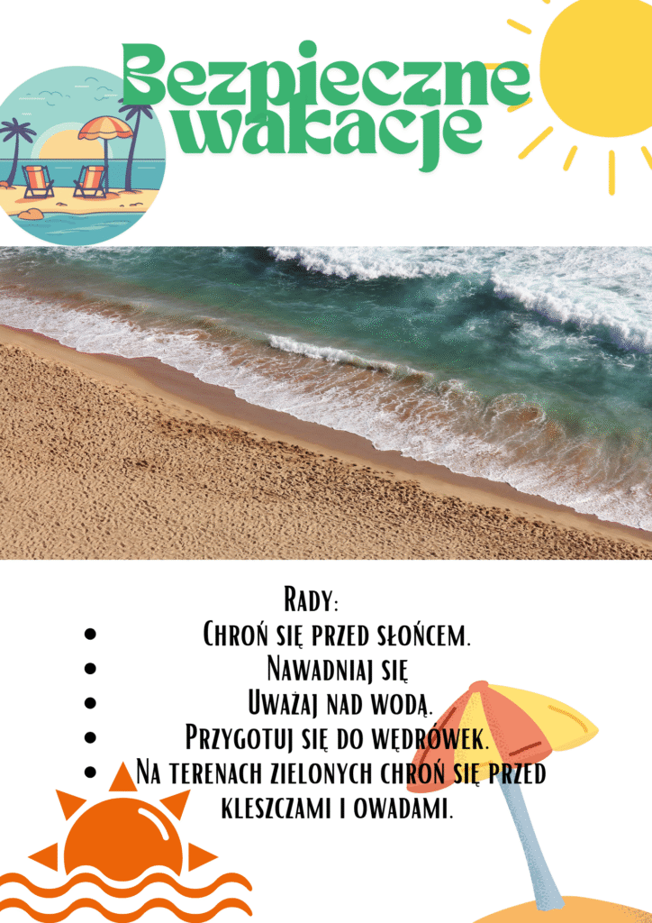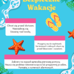 Podczas zajęć informatyki uczniowie naszej szkoły przygotowali kreatywne projekty poświęcone tematowi bezpieczeństwa w czasie wakacji. Korzystając z aplikacji Canva, stworzyli plakaty i grafiki edukacyjne, które przypominają o zasadach bezpiecznego wypoczynku – nad wodą, w górach, a także w sieci.