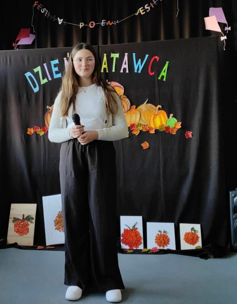 Jury przyznało również wyróżnienie dla Oliwii Świerzy z klasy 7 – za oryginalność i artystyczną dojrzałość występu.