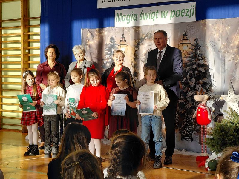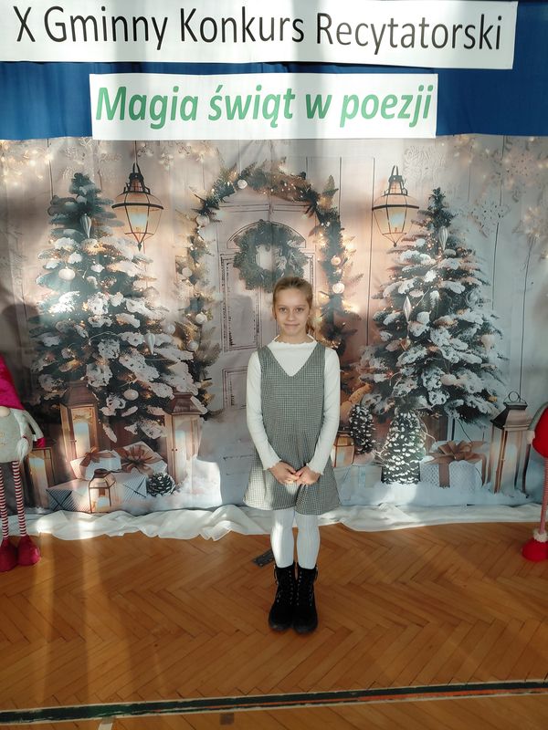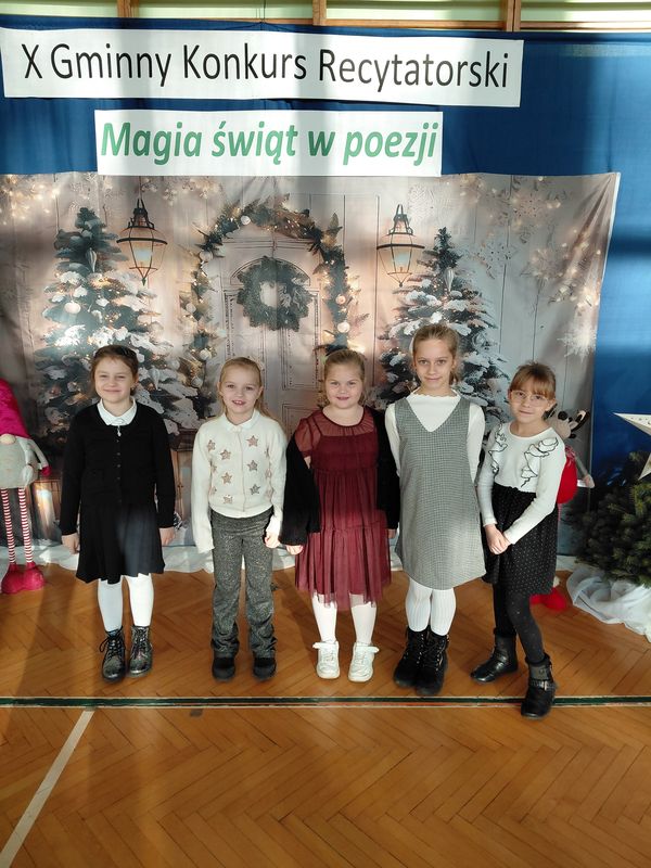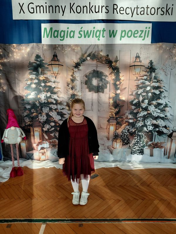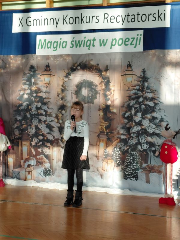 W konkursie wzięli udział przedstawiciele wszystkich szkół z terenu naszej gminy, którzy wcześniej pomyślnie przeszli eliminacje klasowe. Uczniowie zaprezentowali różnorodne utwory o tematyce świątecznej – o Mikołaju, choince czy wigilijnym stole. Konkurs, mimo rywalizacji, przebiegał w miłej atmosferze, a występy małych artystów dostarczyły publiczności wielu wzruszeń i radości. Poziom recytacji był bardzo wysoki, co świadczy o dużym zaangażowaniu uczniów i ich opiekunów. Miło nam poinformować, że w kategorii klas pierwszych drugie miejsce zajęła Karolina Piasecka, a w kategorii klas trzecich trzecie miejsce zajęła Jagoda Cymbalista, a pierwsze Matylda Drobisz. Gratulujemy!