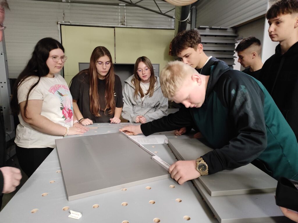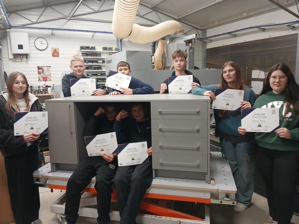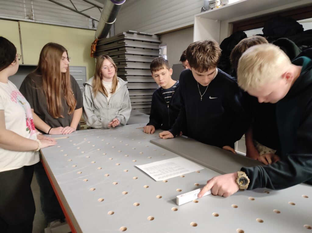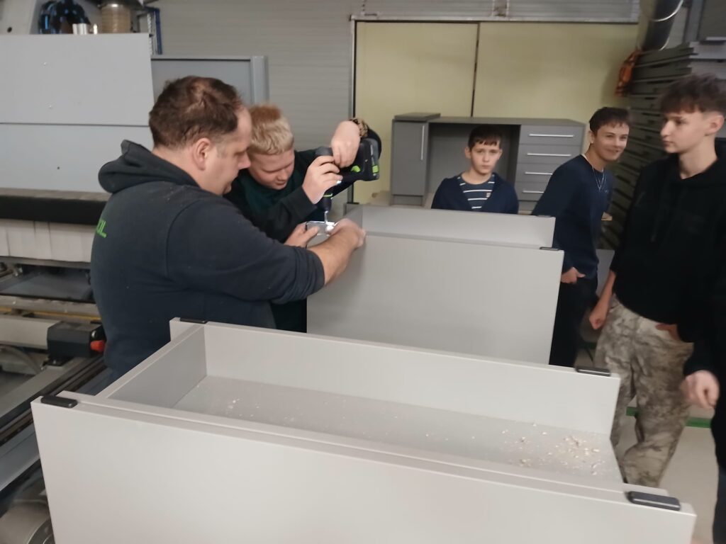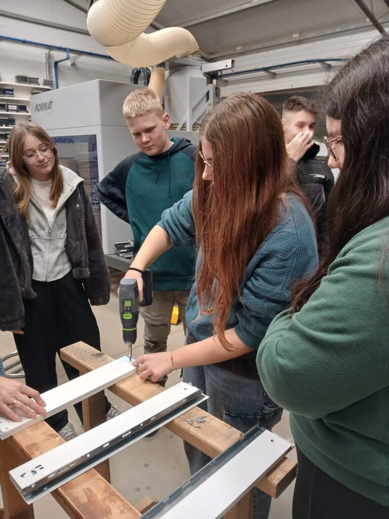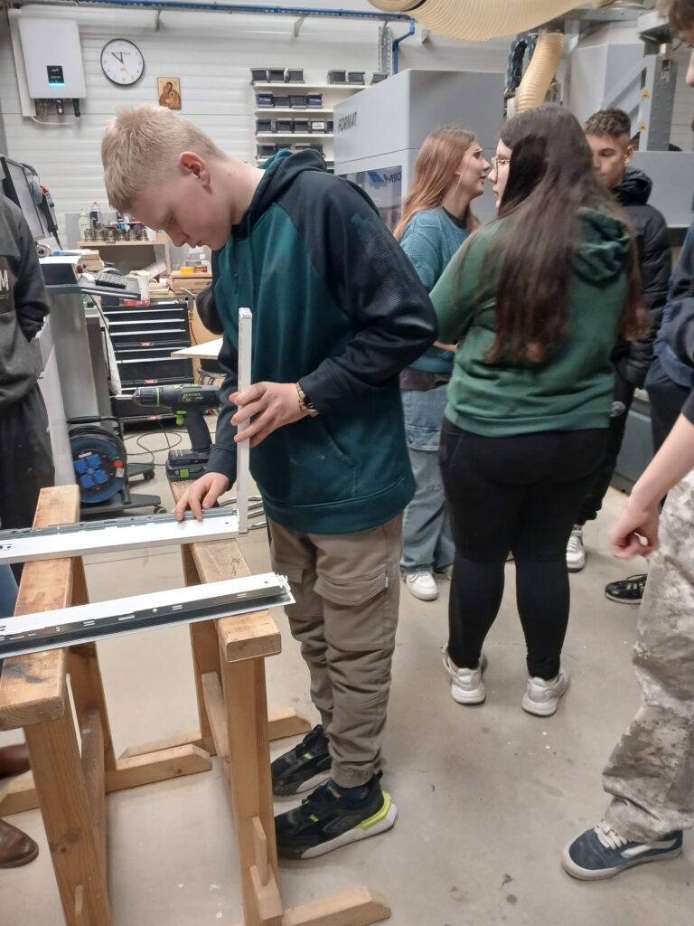 Podczas warsztatów uczniowie mogli zobaczyć, jak powstaje mebel od podstaw – zaczynając od projektu komputerowego wykonanego w specjalistycznym programie, a kończąc na fizycznym montażu elementów.