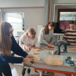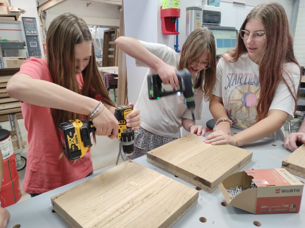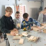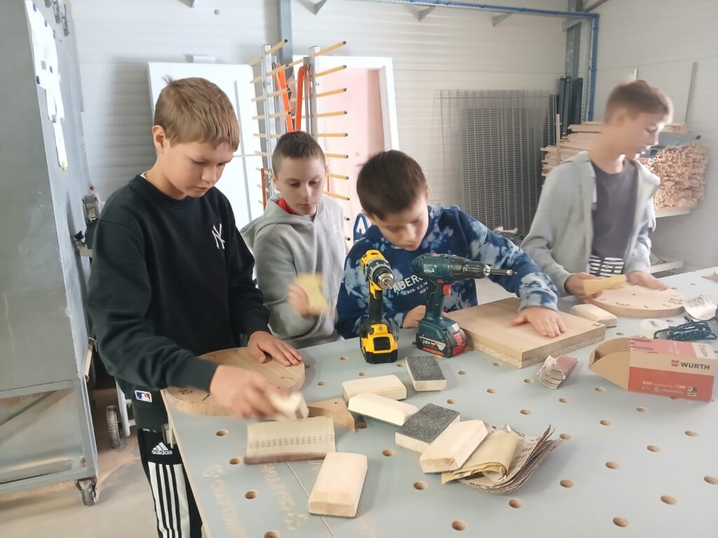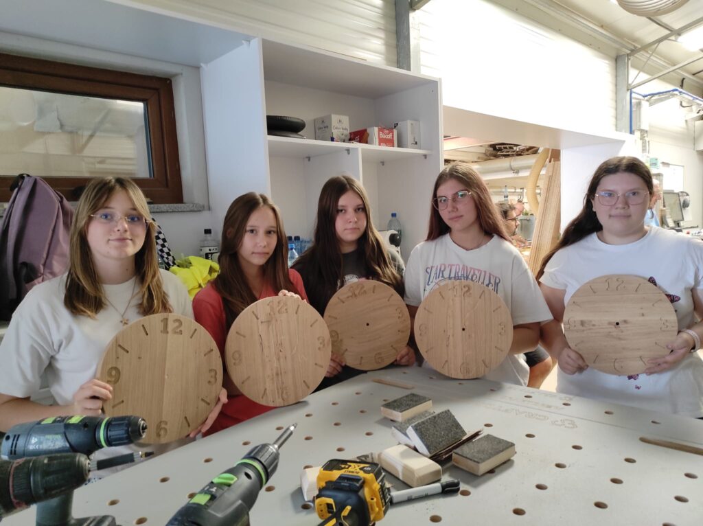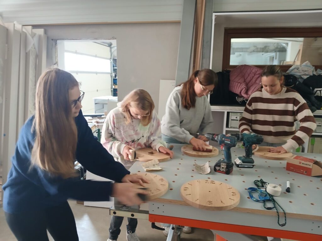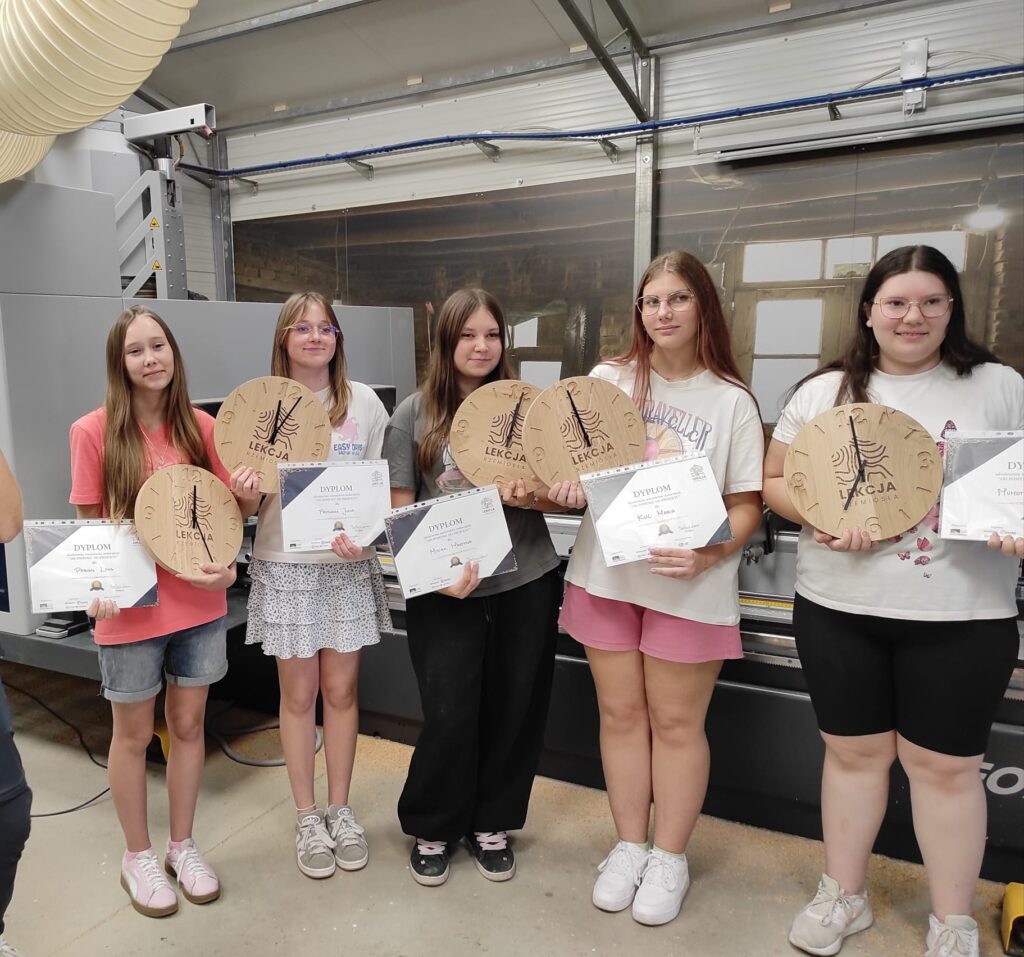 Podczas zajęć młodzież miała okazję samodzielnie wykonać zegary – począwszy od stworzenia projektu komputerowego, poprzez przycinanie elementów, aż po laserowe wycinanie logo. Uczniowie z dużym zaangażowaniem uczestniczyli w każdym etapie pracy, poznając nowoczesne technologie wykorzystywane w stolarstwie.
