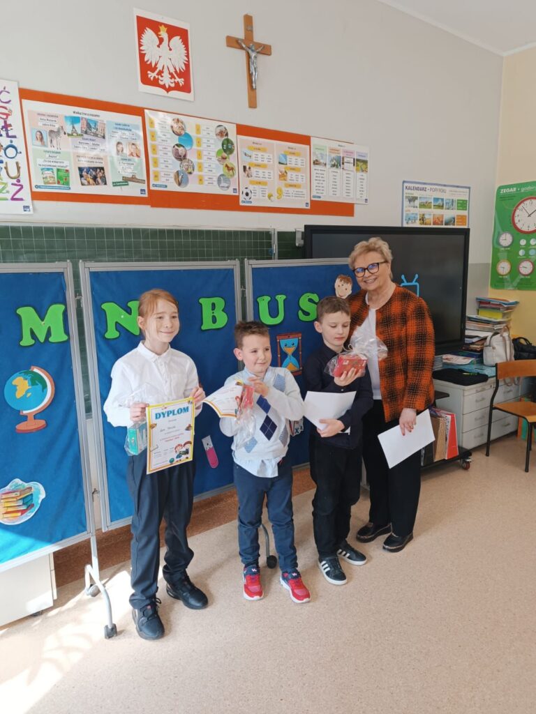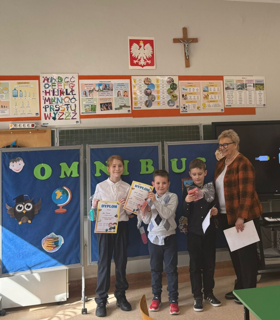 10 marca w Publicznej Szkole Podstawowej im. Janusza Korczaka w Polskiej Nowej Wsi odbył się konkurs wiedzy „Omnibus” dla klas I–III. Nasi uczniowie w składzie: Jan Lachnik, Jakub Walczybok, Leon Śleziak mieli szansę zaprezentować swoje umiejętności podczas testu z różnych dziedzin nauki. Oprócz wiedzy teoretycznej sprawdzono także takie umiejętności, jak współpraca, komunikacja w grupie, umiejętność podejmowania decyzji oraz praca w ograniczonym przedziale czasowym. Nasi uczniowie odnieśli sukces, zdobywając III miejsce. Serdecznie gratulujemy i życzymy dalszych sukcesów!