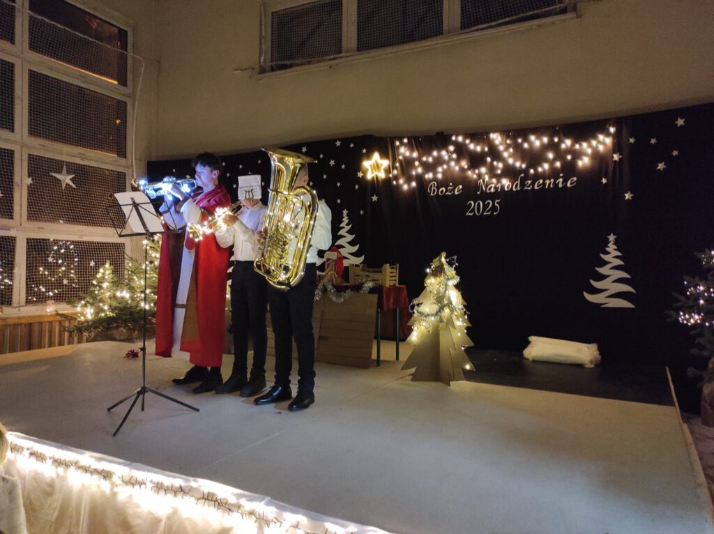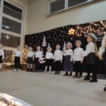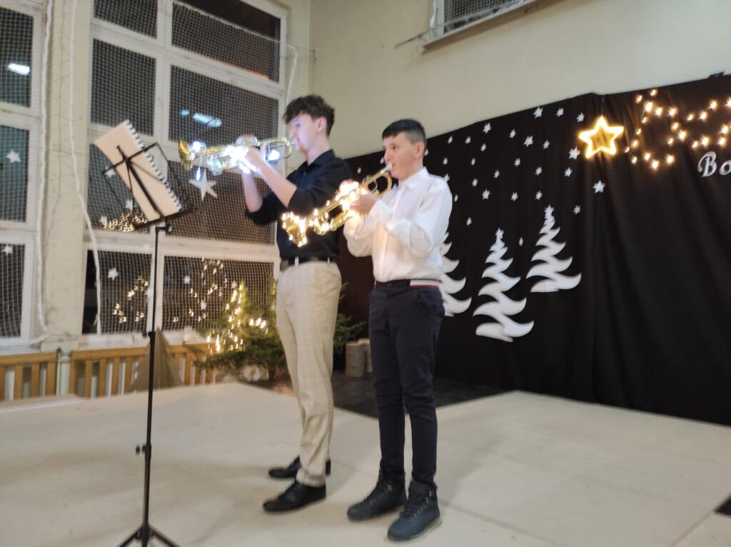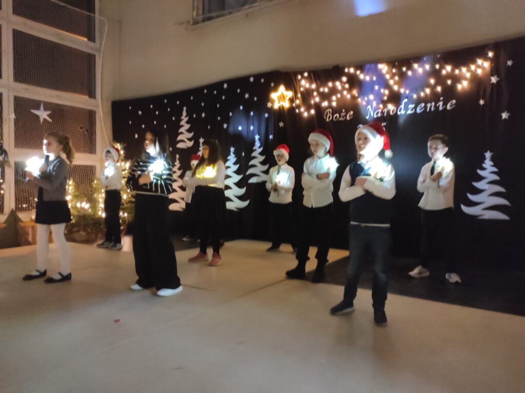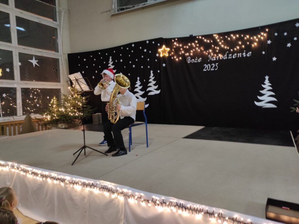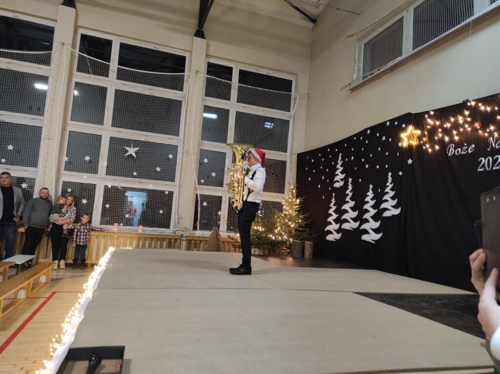 Wyjątkowy, świąteczny koncert rozpoczęły tradycyjnie występy grup przedszkolnych. Małe i większe elfy i aniołki zaśpiewały dla nas o Bożym Narodzeniu, życząc równocześnie Wesołych Świąt! Dalej, szanowni goście, nauczyciele i rodzice wsłuchiwali się w kolejne utwory, które prezentowały poszczególne klasy. Wielu z nas zachwycił taniec „Przyjdź mój Panie, malutki Panie” w wykonaniu uczniów klasy IIIA oraz duet: Szymon z klasy VIII i Dominik z klasy VI, którzy zagrali nam na trąbkach kolędę „Dzisiaj w Betlejem”. Mogliśmy też podziwiać tańce do świątecznych melodii, usłyszeć Bożonarodzeniowe wiersze i obejrzeć przedstawienie „Świąteczny Targ Cudów”, które przygotowało Szkolne Kółko Teatralne. W ostatnim występie wieczoru zaprezentowało się instrumentalne trio: dwie trąbi (Szymon i Dominik) i tuba – Eryk z klasy VII. Zagrali dla nas „Cichą noc”.