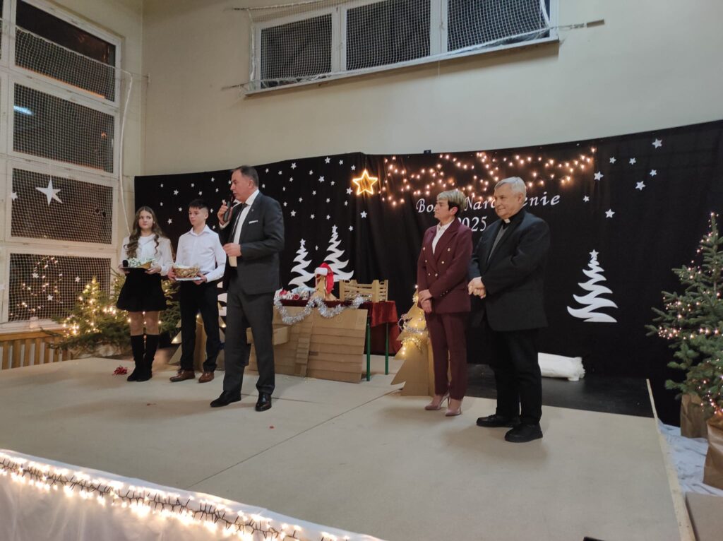 Całość spotkania podsumowali: pani dyrektor – Maria Chudala, pan burmistrz – Krzysztof Cebula oraz ksiądz proboszcz – Krystian Ziaja gratulując występów, składając świąteczne życzenia i zapraszając do wspólnego dzielenia się opłatkiem.