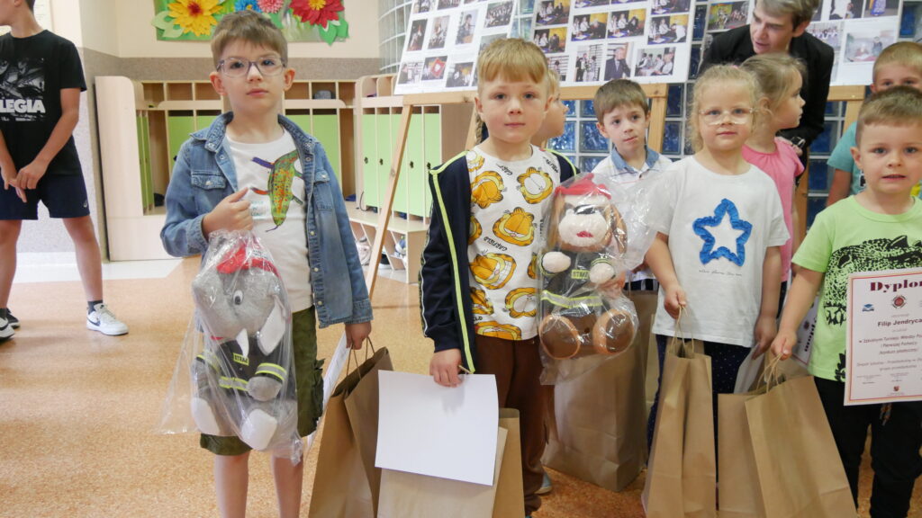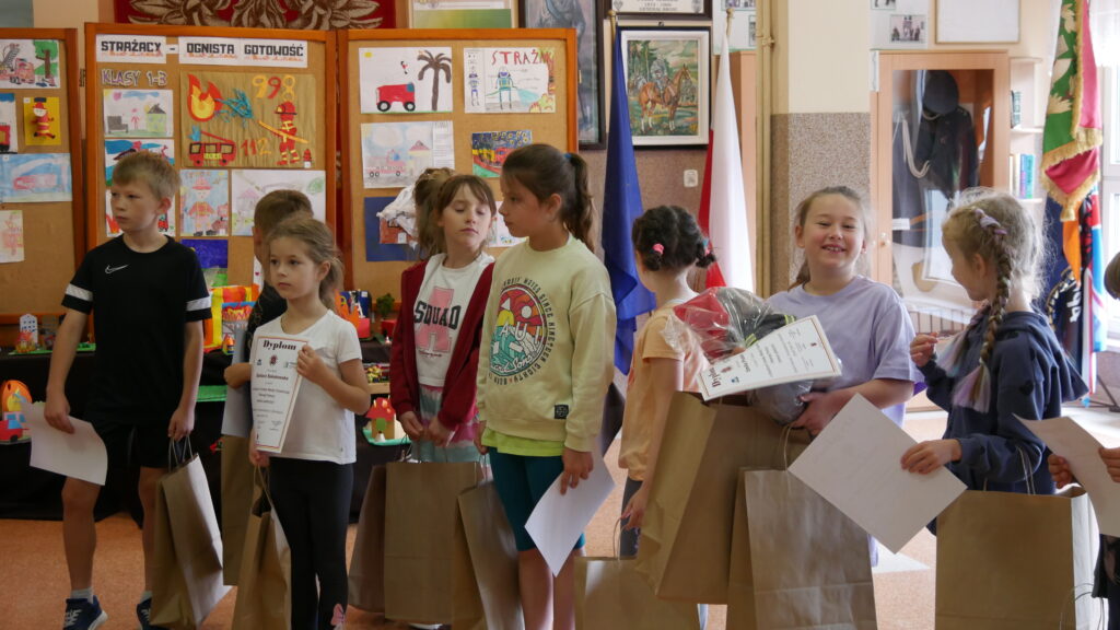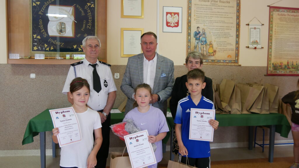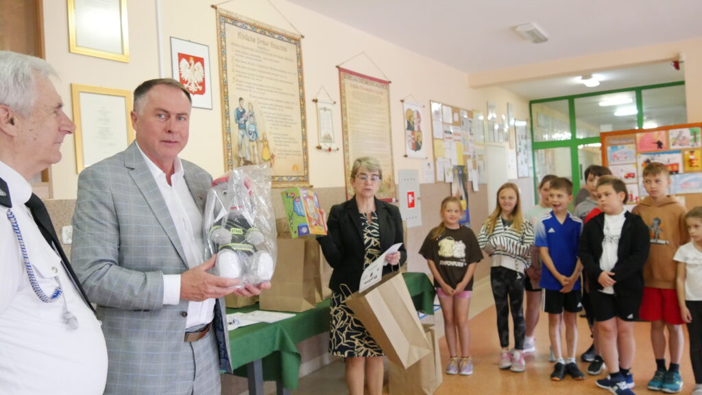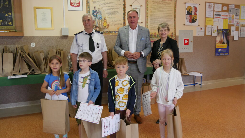21 maja gościliśmy u nas wyjątkowe osoby: Burmistrza Prószkowa – p. Krzysztofa Cebulę, Prezesa OSP Złotniki -p. Jerzego Wockę, Komendanta gminnego OSP – p. Tadeusza Domaradzkiego. Powodem spotkania był turniej wiedzy pożarniczej i pomocy przedmedycznej dla uczniów klas IV-VIII, a także konkurs prac plastycznych dla przedszkolaków i uczniów klas I-III. Trochę statystyki – w bieżącym roku w konkursie plastycznym wzięło udział 18 przedszkolaczków i 27 uczniów klas młodszych, a swoją wiedzą wykazało się 32 uczniów klas IV-VIII.