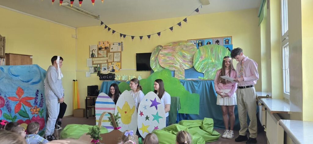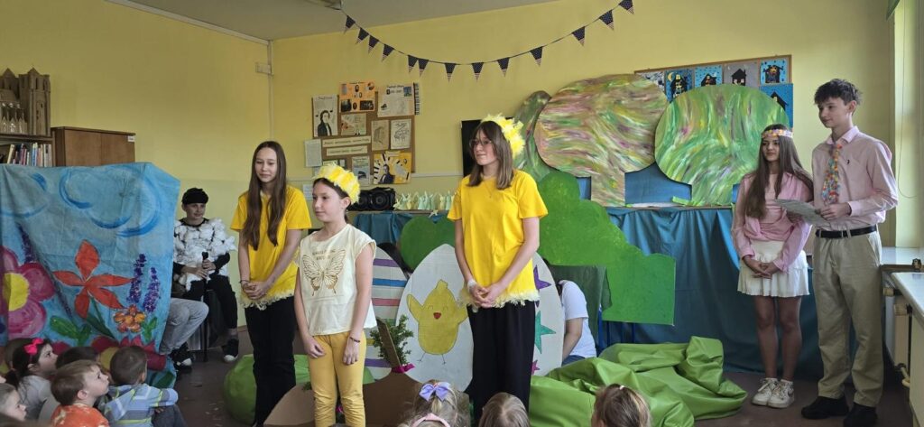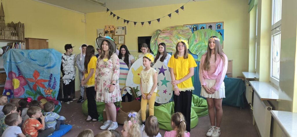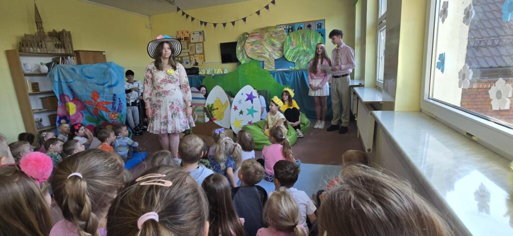 Dnia 7 maja 2025 roku w naszej szkole odbył się wyjątkowy spektakl zatytułowany „Wielkanoc w przedszkolu”. To piękne wydarzenie zgromadziło dzieci z lokalnego przedszkola, które z ogromnym entuzjazmem uczestniczyły w wydarzeniu. Przedstawienie miało na celu przybliżenie najmłodszym tradycji związanych z Wielkanocą w sposób kreatywny i edukacyjny.