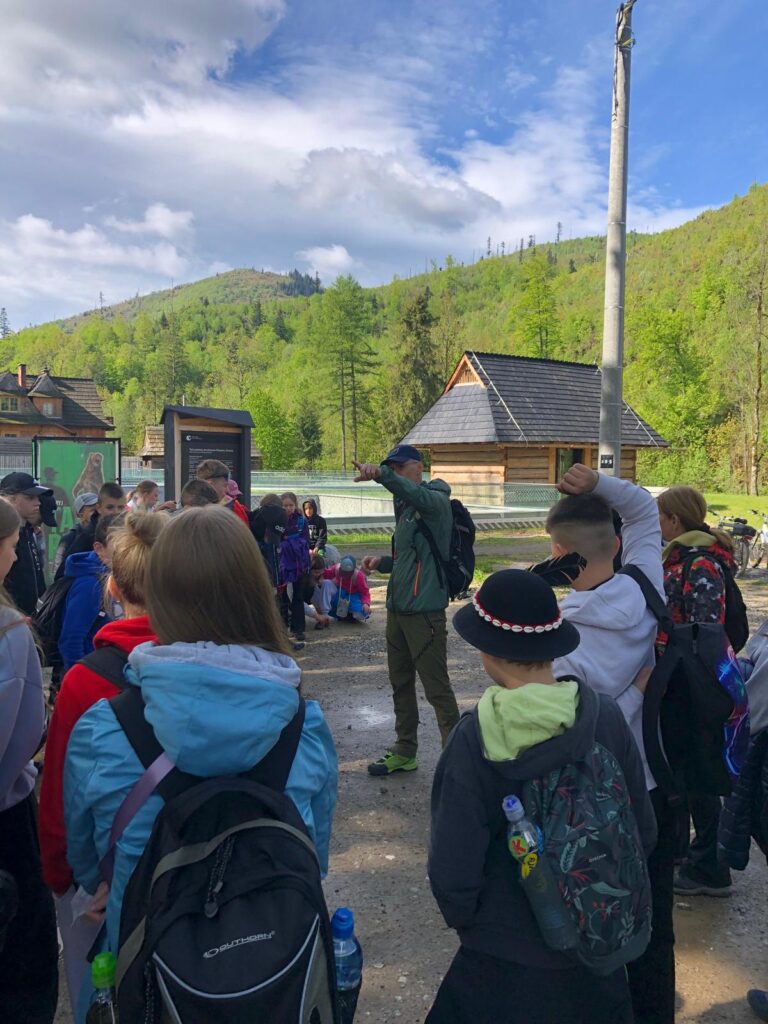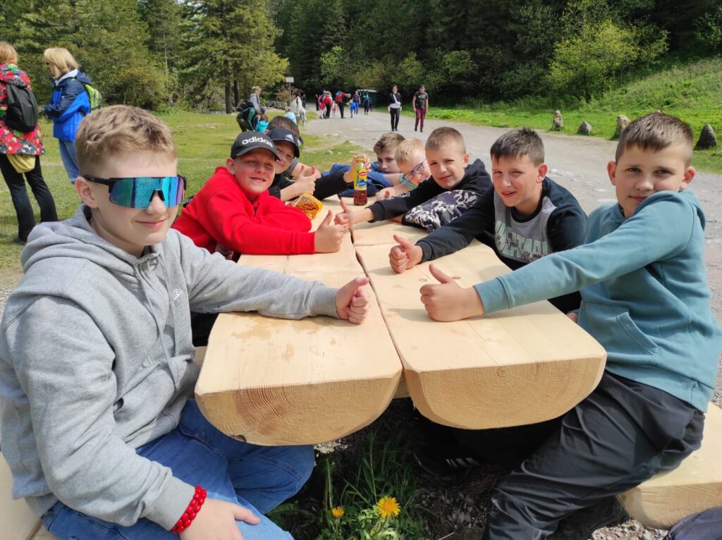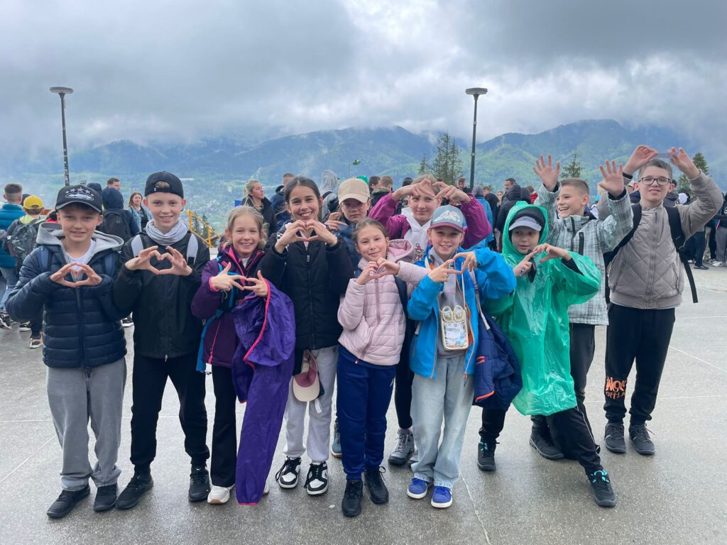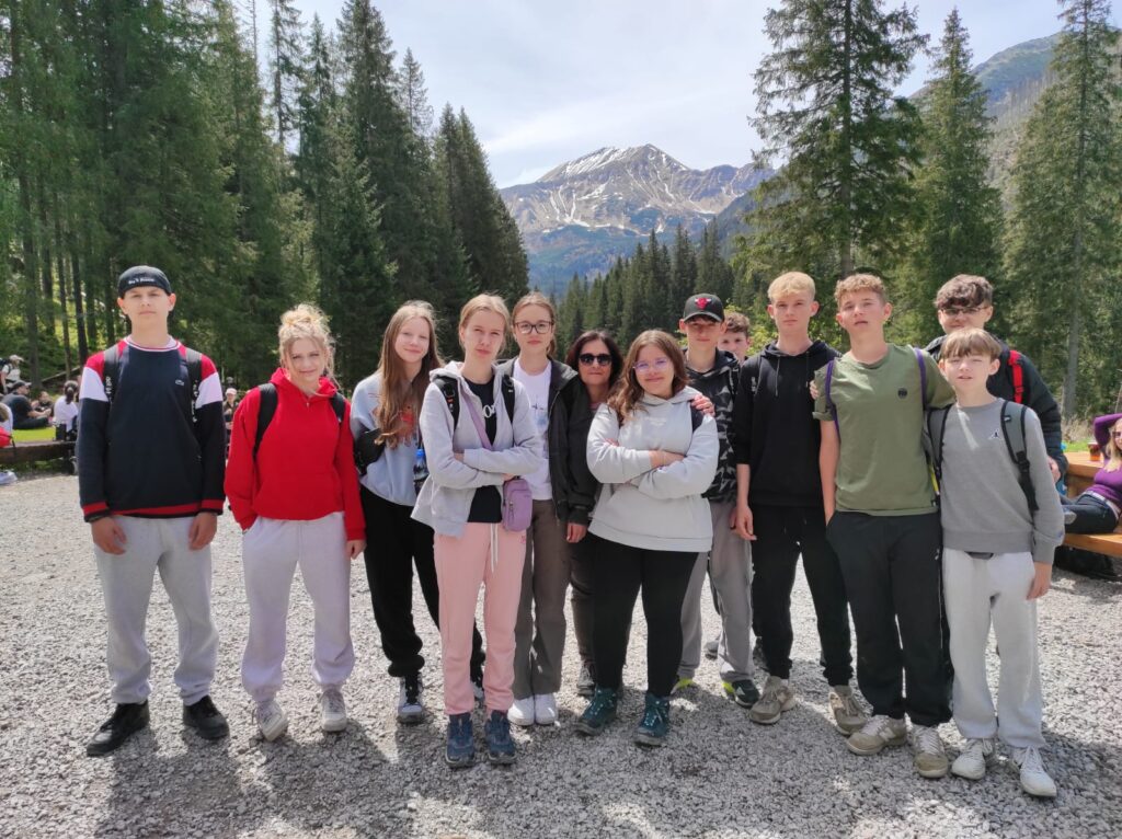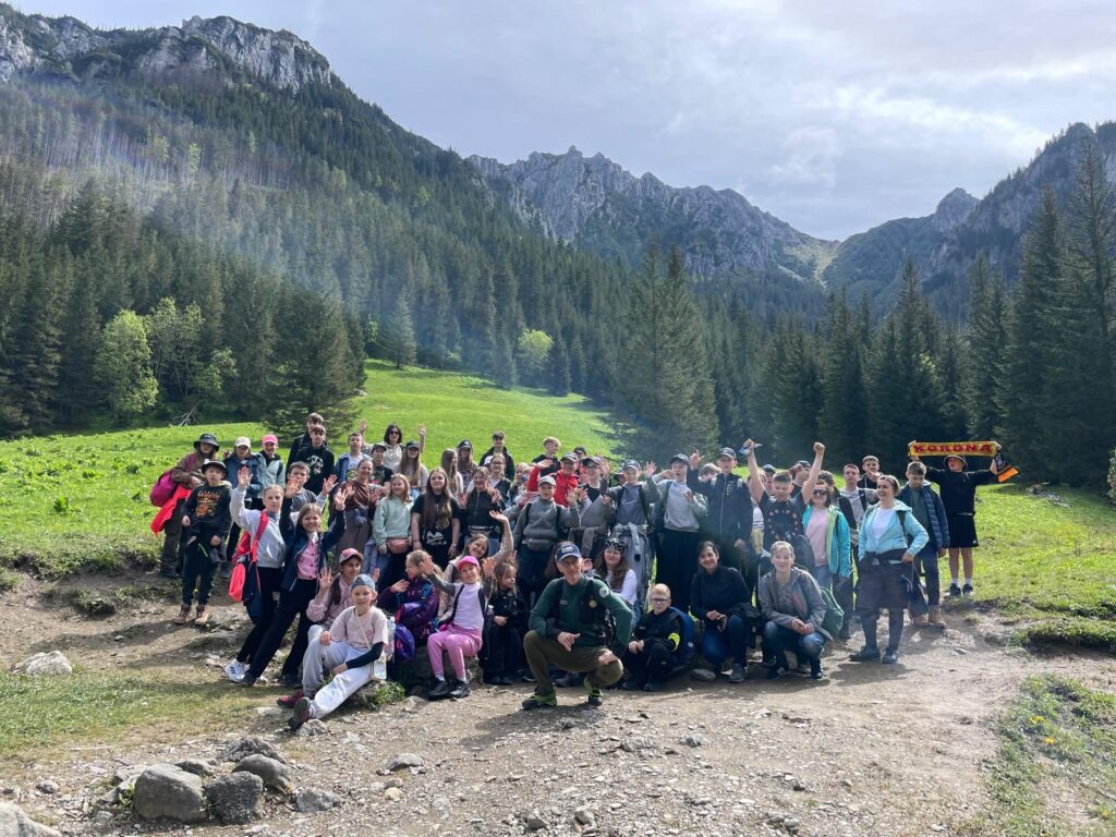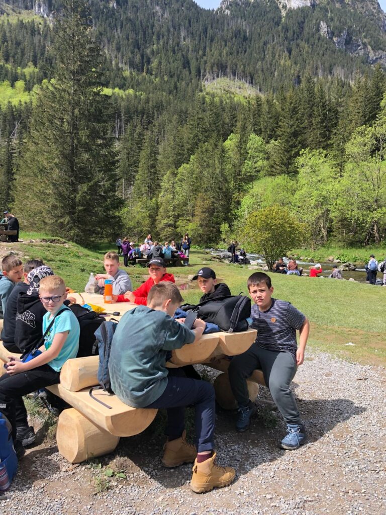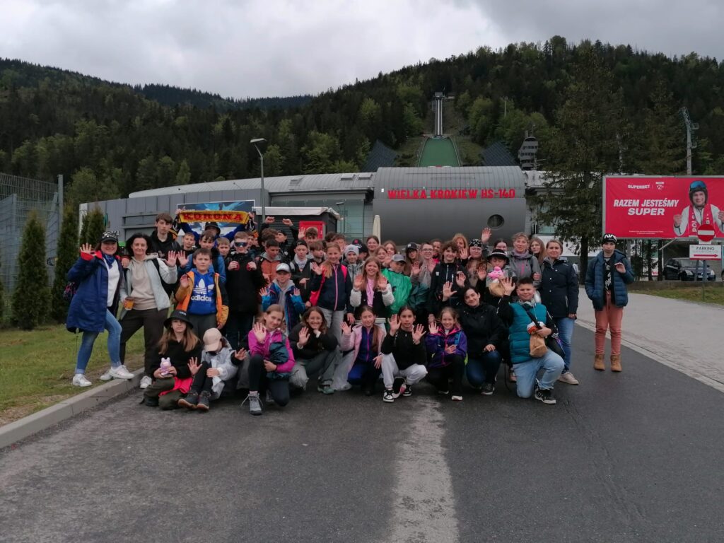 29 i 30 maja klasy IV -VIII były na wycieczce w Zakopanem, gdzie poznawały krajobrazy i kulturę tatrzańską. Pogoda w pierwszym dniu nie zachęcała do pieszych wędrówek, ale i tak cały plan został zrealizowany: najpierw wjechaliśmy kolejką na Gubałówkę, skąd rozciąga się piękna panorama Tatr, potem przeszliśmy spacerkiem na cmentarz na Pęksowym Brzyzku i na Krupówki, a następnie pod Wielką Krokiew, by wdrapać się na jej szczyt (niektórym zajęło to zaledwie 10 minut🙃). W ośrodku zjedliśmy obiadokolację, zaśpiewaliśmy ” Sto lat” Marcelinie, która miała urodziny i przeszliśmy do izby regionalnej, aby posłuchać jak pan Gąsienica opowiada o kulturze tatrzańskiej. Dzień zakończyliśmy ogniskiem i kiełbaskami, które dzielnie piekły panie: Klaudia i Monika. Następny dzień przywitał nas słoneczkiem. Po śniadaniu spotkaliśmy się z panem przewodnikiem, który przeprowadził nas przez Dolinę Kościeliską, pokazywał szczyty, które mijaliśmy i ciekawie o nich opowiadał. W schronisku można było posilić się tradycyjną szarlotką, a na koniec zatrzymaliśmy się przy bacówce i próbowaliśmy pysznych oscypków. Po rozstaniu z przewodnikiem udaliśmy się w drogę powrotną do Złotnik, skąd odebrali nas stęsknieni rodzice. To było jedno z tych wydarzeń szkolnych, które pozostają w pamięci na zawsze. Zachęcamy do obejrzenia fotorelacji.